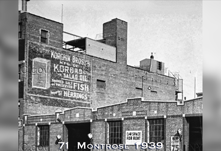 This building is located in Williamsburg Brooklyn. It was built in 1921 by the Korchin family as a production facility for smoked fish. The Korchin family moved to Marshall Smoked fish . See the New York Times review. The graphics on the building remain from the 1920s and 1930s reflecting both businesses dedicated to smoke fish.